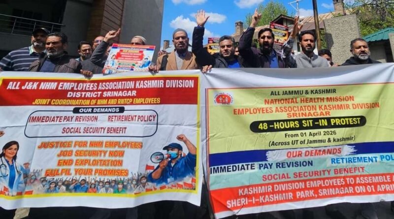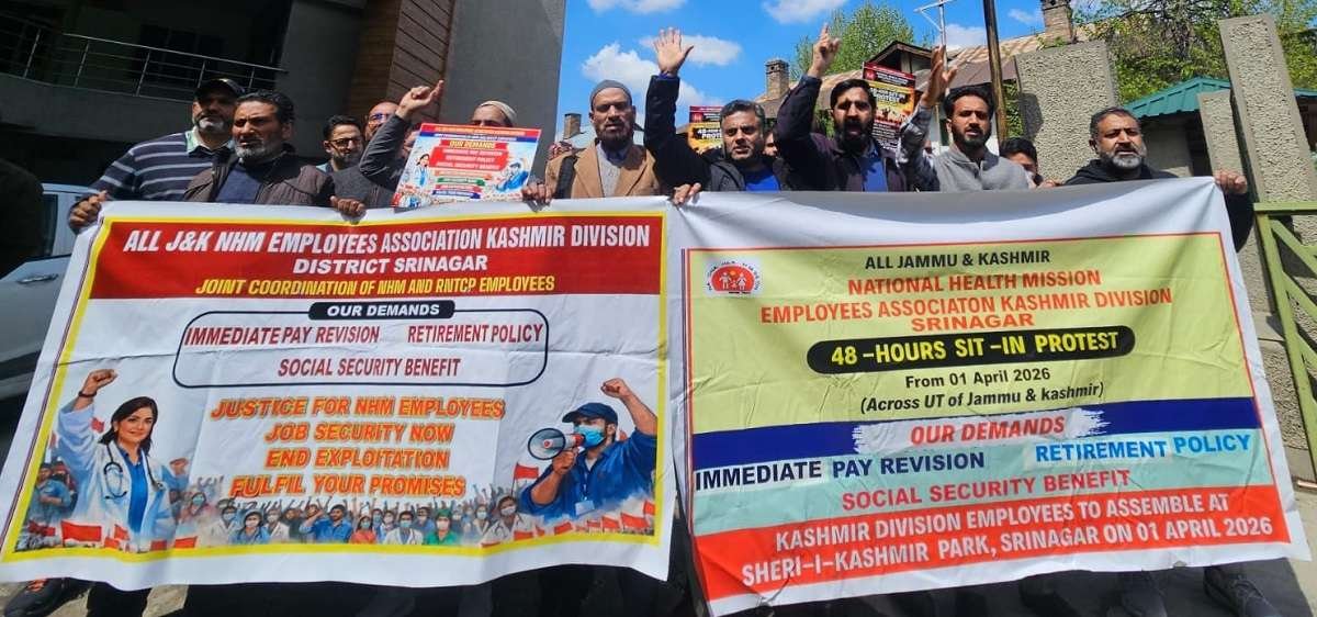 Srinagar, Apr 1: Employees working under the National Health Mission (NHM) in Jammu and Kashmir on Wednesday began a 48-hour sit-in protest to press for their demands, including the regularisation of their services, pay revision and social security benefits.