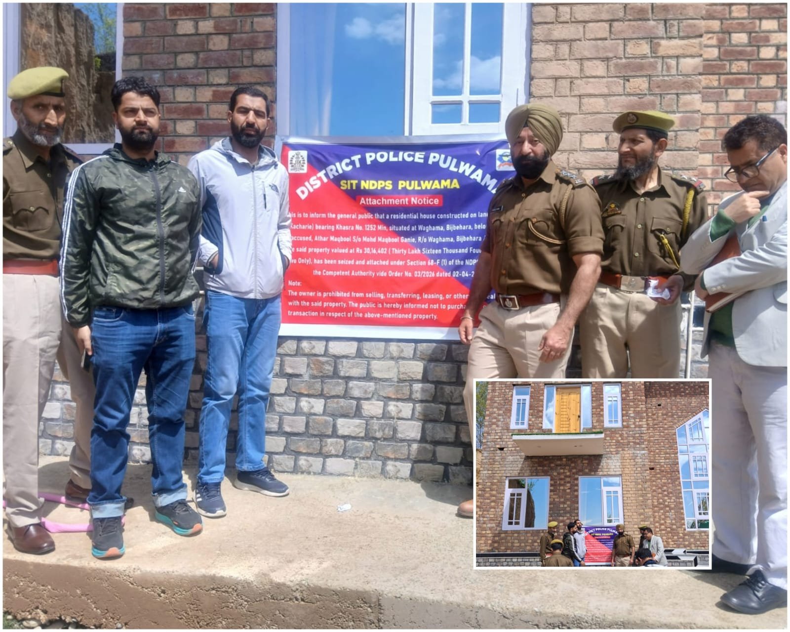 Pulwama, Apr 2: As part of its intensified campaign against narcotics trafficking and with an aim to dismantle the financial network of the drug trade, Pulwama Police has attached a double-storied residential house valued at approximately ₹30,16,402 (Rupees Thirty Lakhs Sixteen Thousand Four Hundred Two only) situated at Waghama Bijbehara.