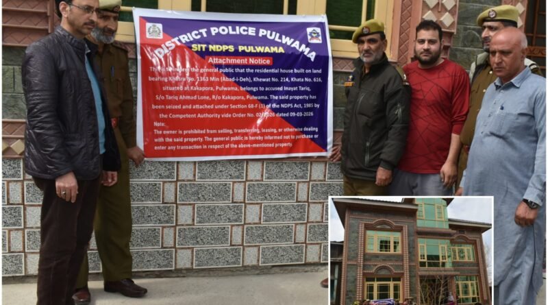 Pulwama, Mar 9: As part of its continued crackdown against narcotics-related activities, Pulwama Police today attached a double-storeyed residential house valued at ₹49,73,207 belonging to Inayat Tariq S/O Tariq Ahmad Lone R/O Kakapora, Pulwama.