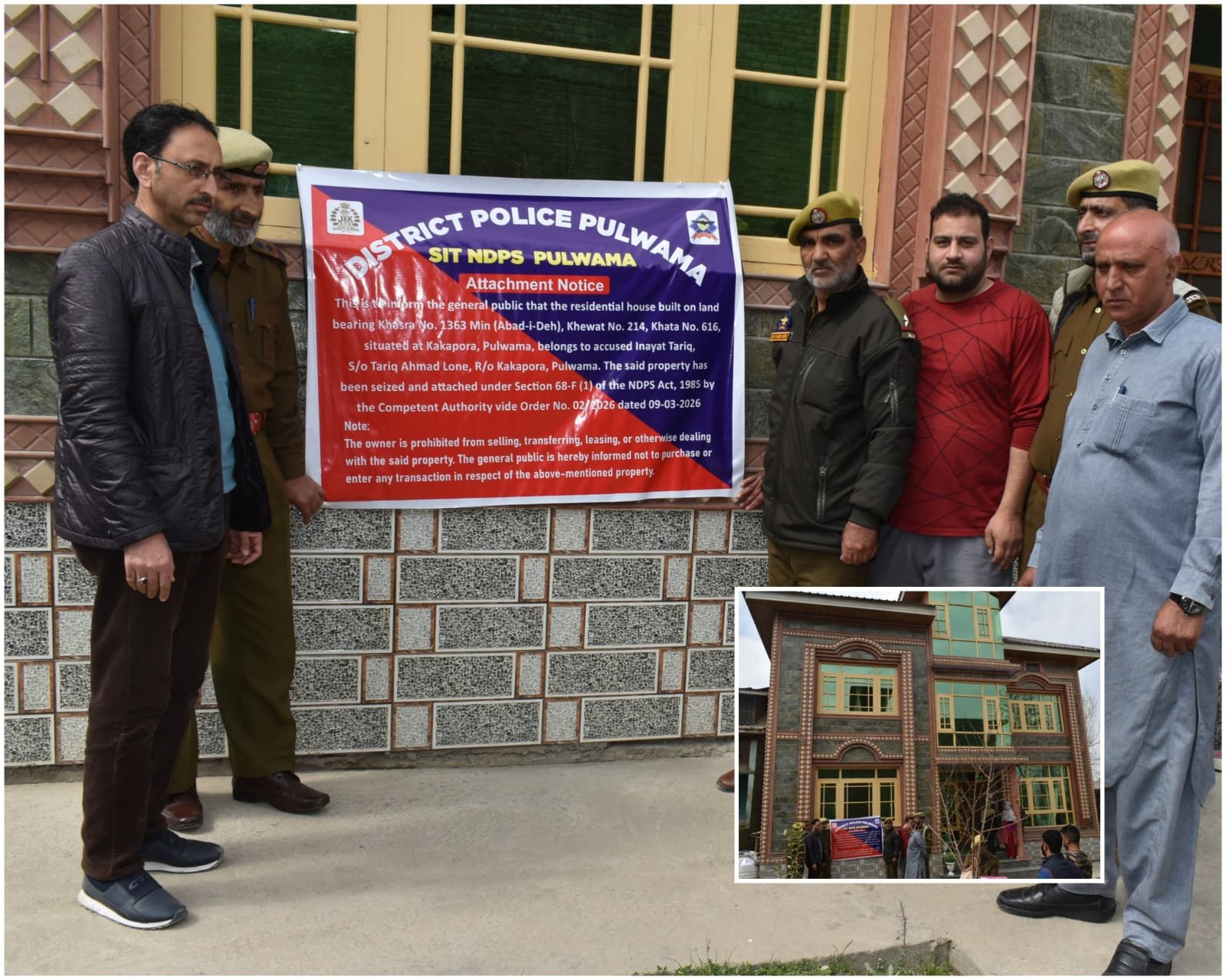 Pulwama, Mar 9: As part of its continued crackdown against narcotics-related activities, Pulwama Police today attached a double-storeyed residential house valued at ₹49,73,207 belonging to Inayat Tariq S/O Tariq Ahmad Lone R/O Kakapora, Pulwama.